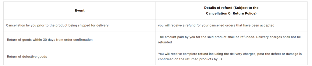 Refunds are provided for cancellation / return of products, subject to the eligible cancellation/ return as per Return Policy or these terms and conditions, initiated in accordance with the Return or Cancellation Policy. Given the same, the refunds would be initiated as under: